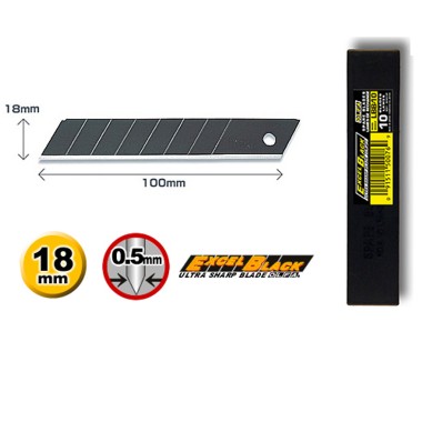 Experiências e testes contínuos tem mostrado que um ângulo de 59° é o ângulo perfeito para uma Lâmina destacável. A lâmina Olfa LBB-10 possui 18mm de largura e 0.38mm de espessura.