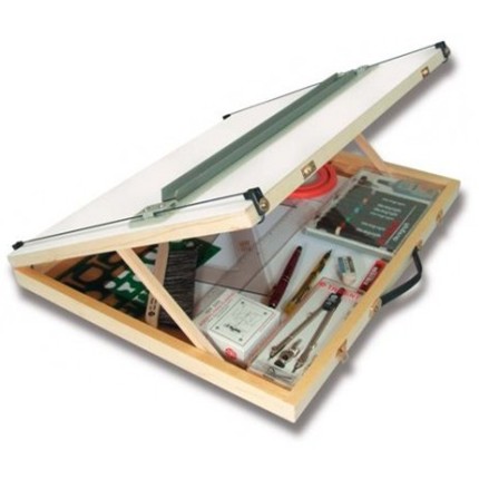 Prancheta tipo maleta Trident, finamente acabado, com espaço para guardar desenhos de projetos e materiais para desenho.